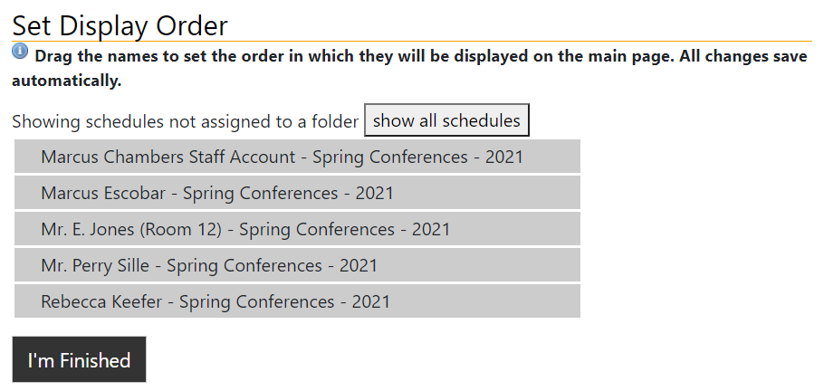 Drag and drop the schedule names into the desired order. All changes save automatically.