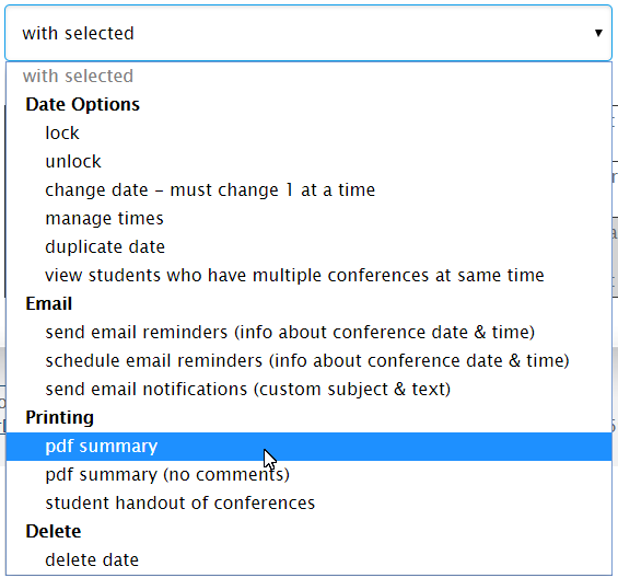 - Using the "with selected" dropdown menu at the top of the screen, select "pdf summary" or "pdf summary (no comments"