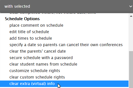 - Using the "with selected" drop-down menu at the top of the screen, select "clear extra (virtual) info" in the Schedule Options section