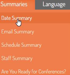 To download student information (including name, parent contact info, conference dates/times) from the Date Summary, please follow these steps: