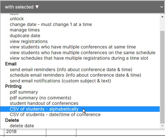 CSV of students - date/time of conference for a list of students who are registered on the selected date(s), sorted by date/time of conference